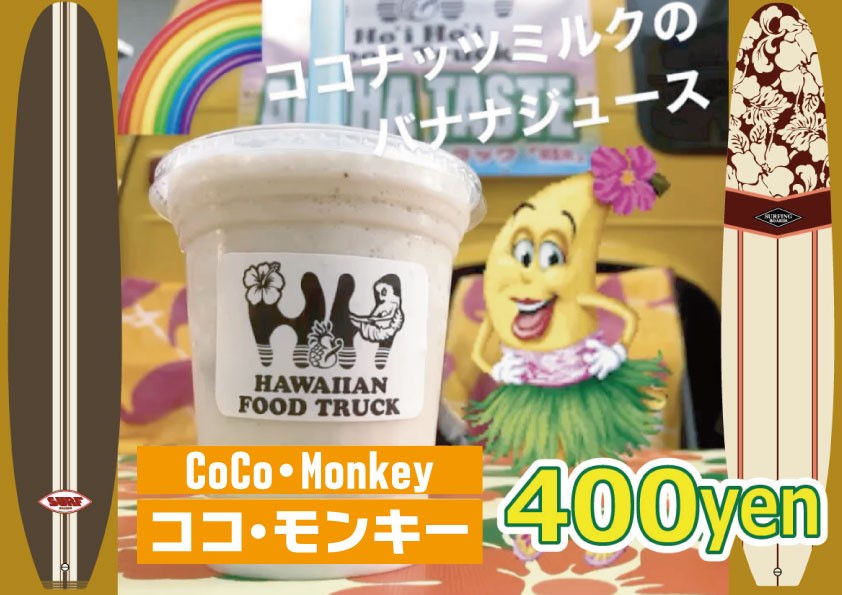その他、ホノルルスタイルのコーヒーやココ・モンキー(ココナッツミルクのバナナジュース)などのドリンク系メニューもご用意しております。