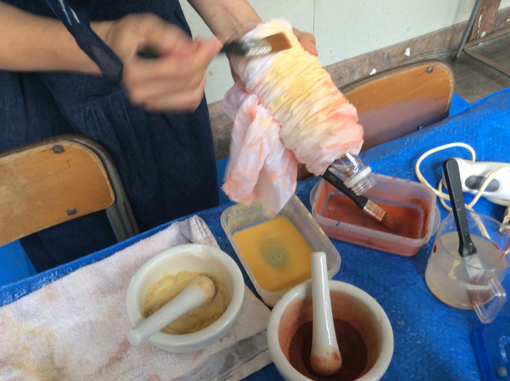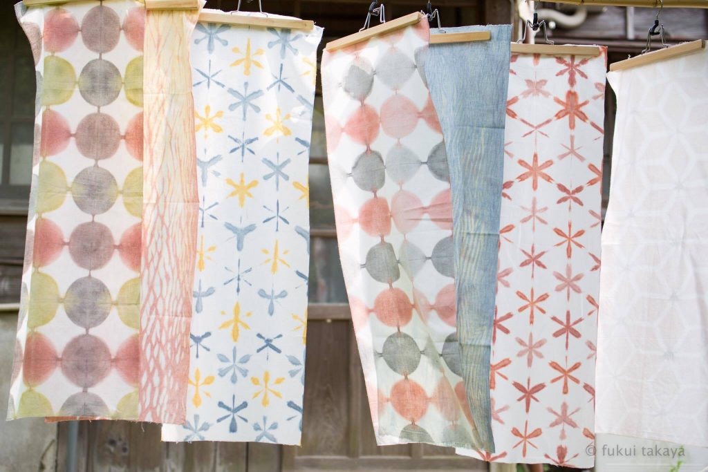土から作ったカラフルな染料で、知多木綿の晒しから手ぬぐいを作ります。日本伝統の板締め染めや、筒絞り染めなどをアレンジして、お子さんでも簡単に製作出来ます。